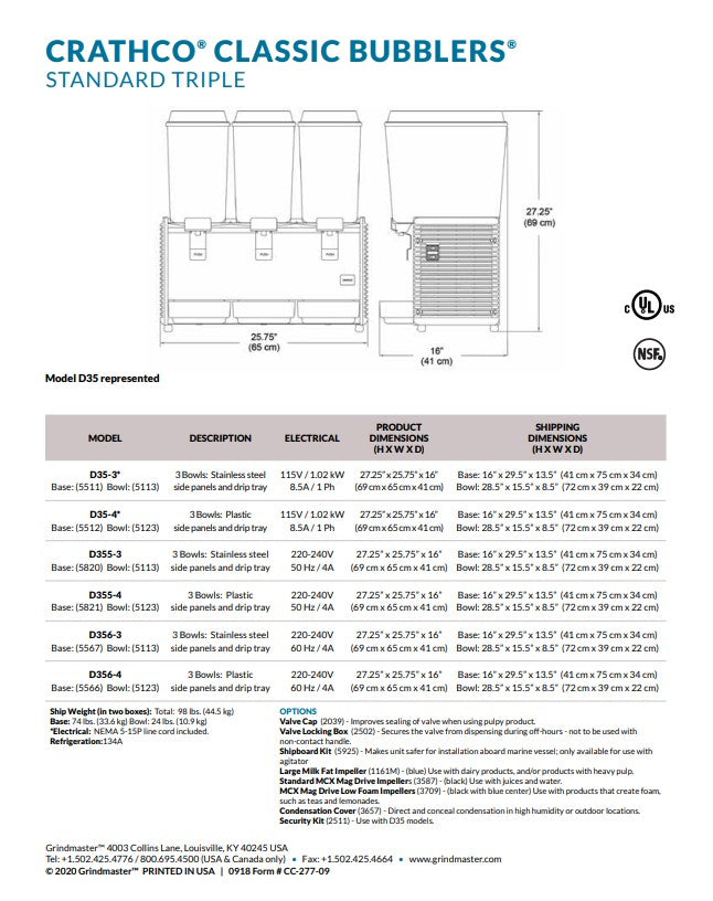 Crathco Classic Bubbler® Premix Cold Beverage Dispenser. (3) 5 gal. bowls. Plastic side panels and drip tray.