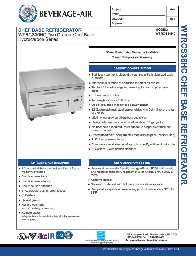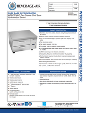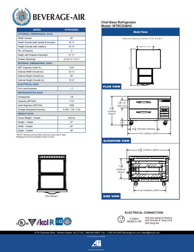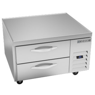 Beverage- Air Worktop Cook Stand Refrigerator, one-section, 36"W, 5.64 cu. ft., (2) drawers, top drawer holds (2) 12" x 20" x 6" pans per drawer & bottom drawer holds (2) 12" x 20" x 6" pans per drawer (NOT included), fire-proof stainless steel top, front & sides (no heat shield required), full marine drip guard, aluminum interior, side-mounted self-contained refrigeration, R290 Hydrocarbon refrigerant, 1/6 HP, cULus, UL EPH Classified, UL-Sanitation, Made in USA