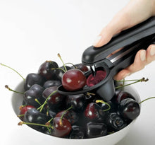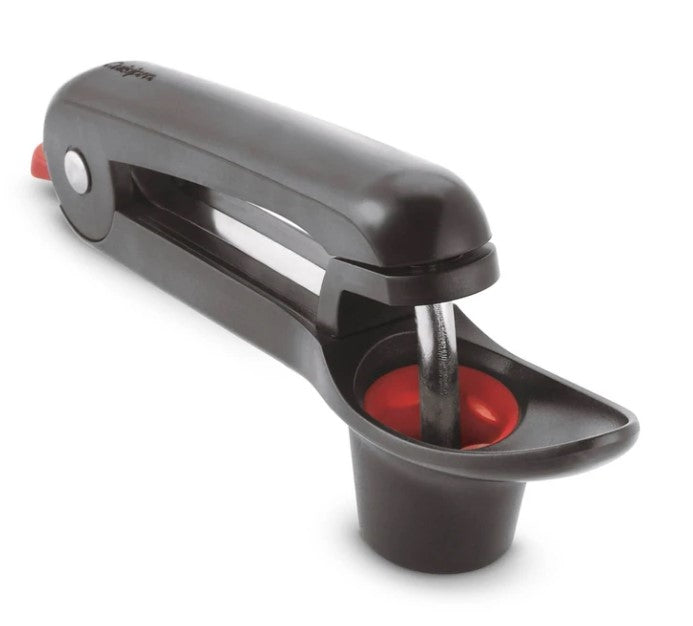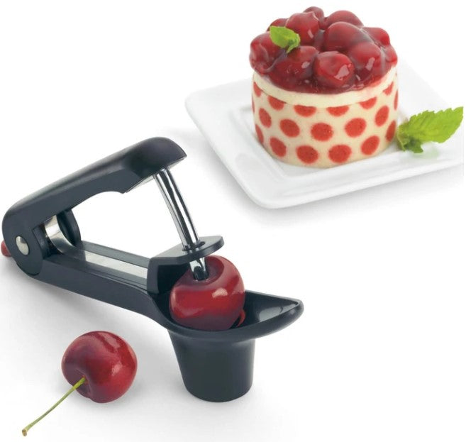 A convenient tool for removing the pits of cherries and olives with ease. • Scoop easily picks up cherries or olives • Splash guard protects work area from juice • Silicone cup with flexible fins for holding both cherries and olives • Locks closed for compact storage • One hand operation mechanism • Stainless steel plunger