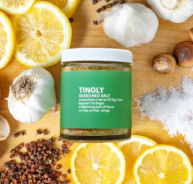 Tingly is a jolt of flavor. It is a blend of our Savory base with Sichuan peppercorns and citrus. We use it on fish, popcorn, and roasted vegetables.